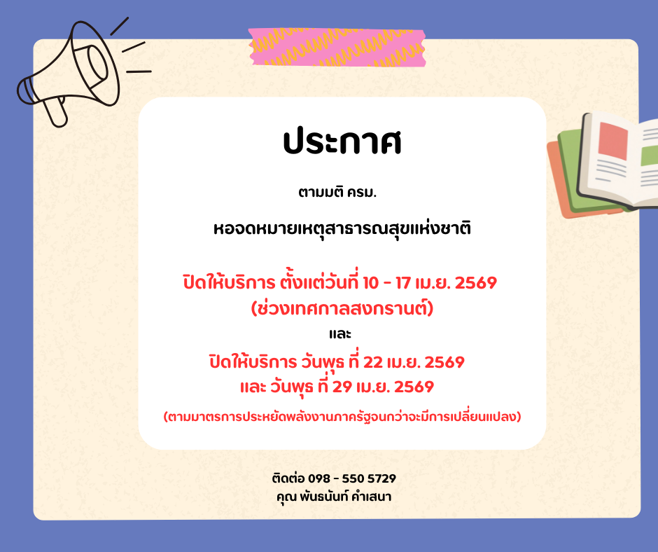 ประกาศ หอจดหมายเหตุสาธารณสุขแห่งชาติ เรื่อง แจ้งปิดให้บริการชั่วคราวในช่วงวันหยุดเทศกาลสงกรานต์และวันหยุดประจำสัปดาห์